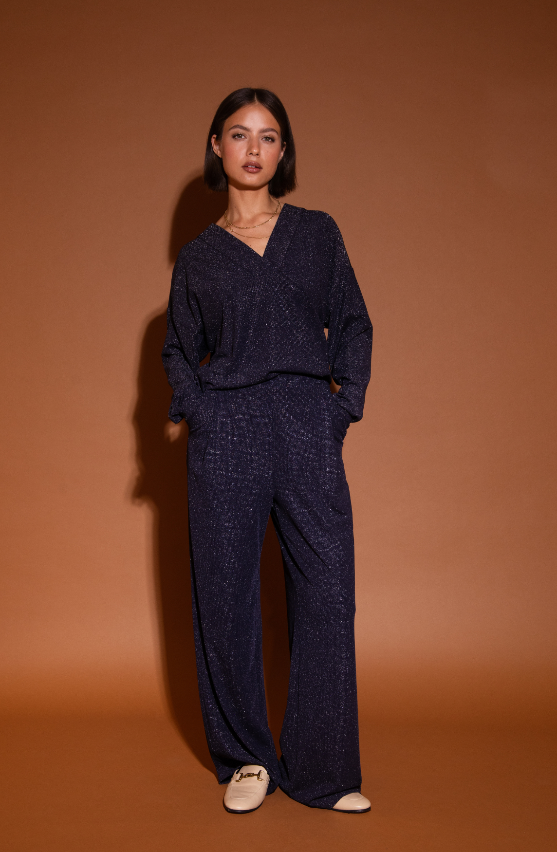 Product information: The Alma Blouse is a beautiful dark blue top with a V-neck. The dark blue fabric has a subtle silver glitter / shine. The top has long sleeves and is a beautiful style to subtly stand out.