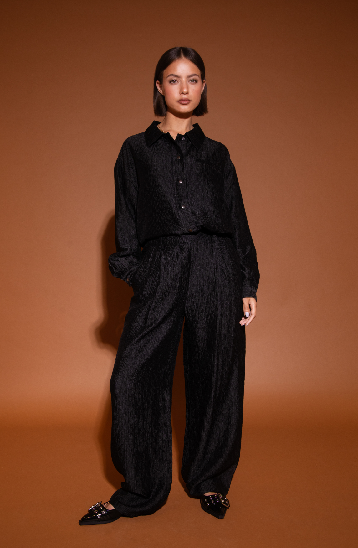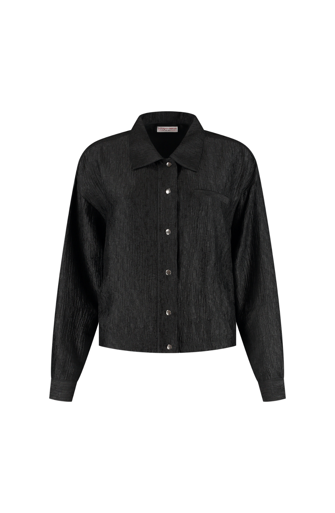 Product information: The Filipa Blouse is a beautiful timeless black blouse. Can also be worn as an indoor jacket. The blouse has press studs on the front. Made of a beautiful black fabric with a small relief in it.