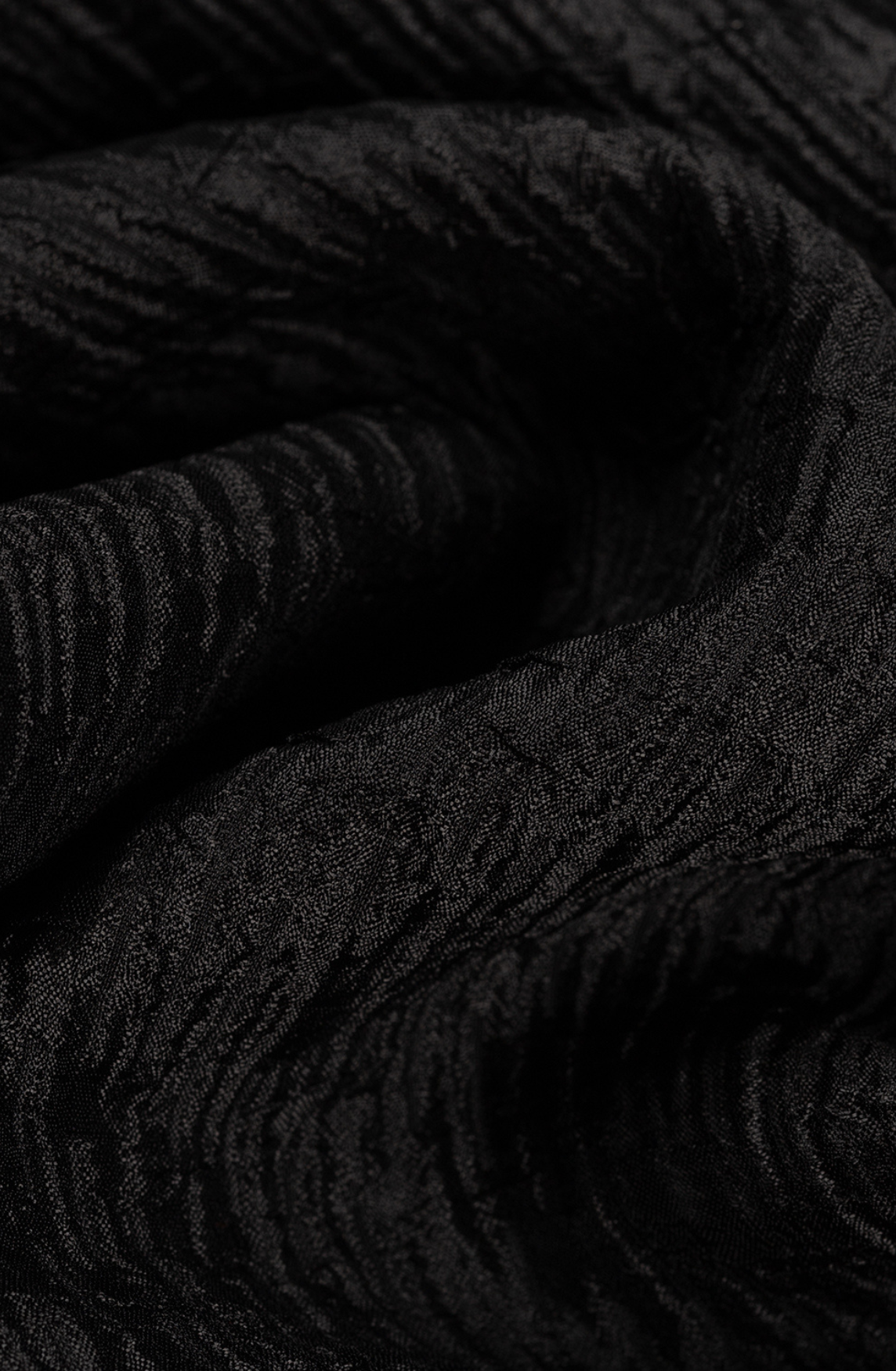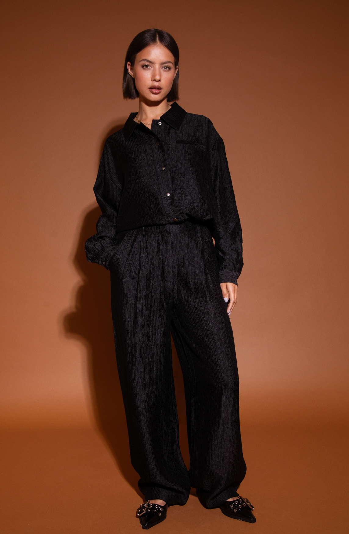 Product information: The Lumi Pants is beautiful timeless black pants / trousers. The waist is high fitted. The legs are wider. Two subtle pleats at the front. Made of a beautiful black fabric with a small relief in it.