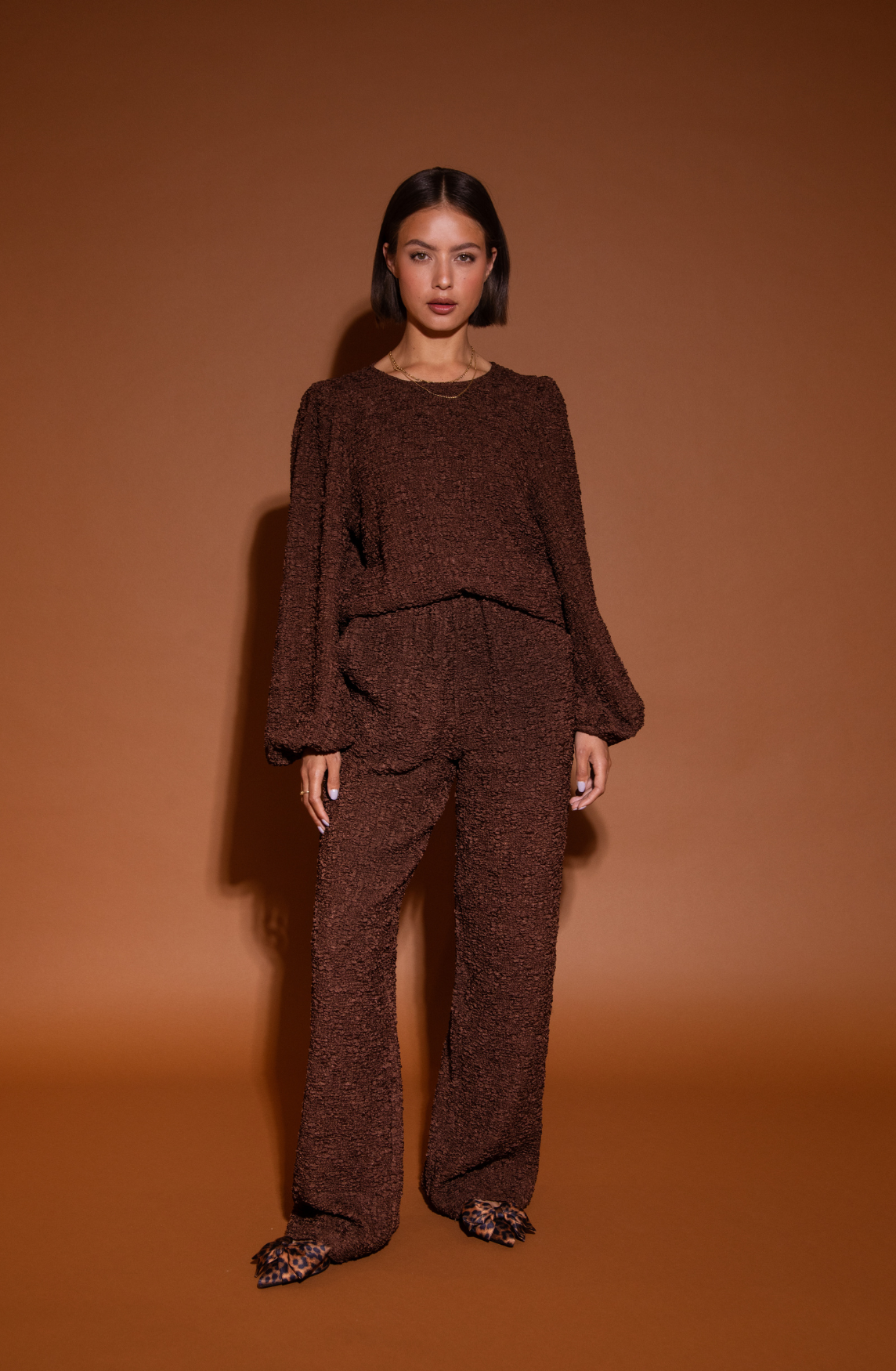 Product information: The Mia Top is made out of a brown material with a playful relief in it. The Top has long sleeves. At the back of the neck is a button-loop closure with which you can easily put on the top.